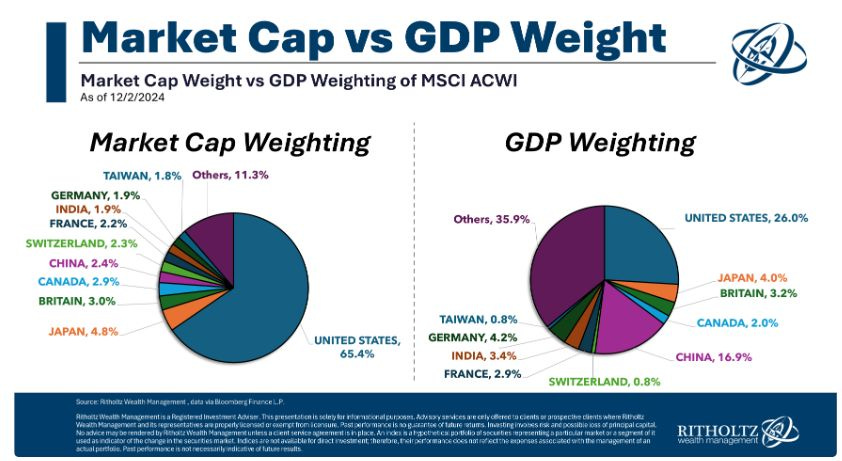 Un esempio emblematico di questi disallineamenti è rappresentato dagli Stati Uniti: la Borsa americana contribuisce al 65,4% della capitalizzazione totale mondiale, dominando il panorama finanziario globale. Tuttavia, il PIL degli Stati Uniti costituisce solo il 26% del PIL mondiale, evidenziando un marcato squilibrio tra il valore attribuito al mercato azionario e il contributo reale dell'economia.