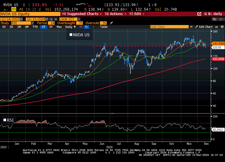 Dall’analisi dei dati emerge chiaramente che, dallo scorso giugno, il prezzo delle azioni di NVIDIA, pur mostrando una certa volatilità, si è stabilizzato intorno a 140 dollari, come indicato dalla linea rossa tratteggiata nel grafico. Questo movimento ha interrotto un trend di crescita pluriennale caratterizzato da un'impressionante progressione al rialzo.