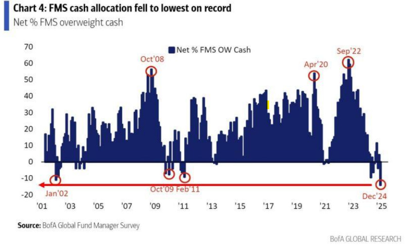 Il secondo grafico evidenzia come la liquidità detenuta dai fondi sia ai livelli più bassi mai registrati da 25 anni a questa parte.