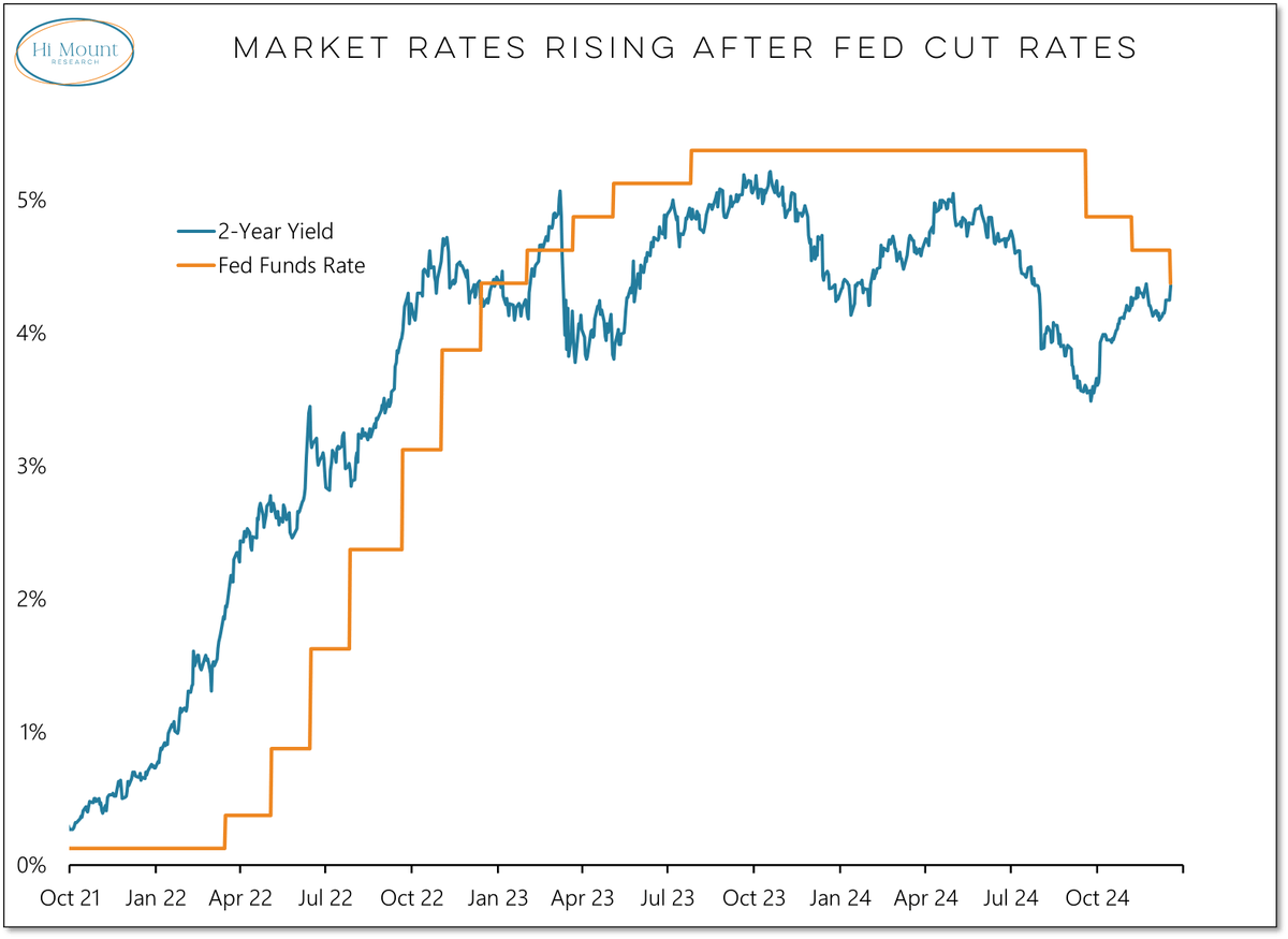 Nel 2024, nonostante i primi tagli dei Fed Funds, i rendimenti a 2 anni sono rimasti elevati, segnalando che il mercato sta prezzando rischi inflazionistici persistenti e aspettative di tassi ancora restrittivi, nonostante l’allentamento della politica monetaria.