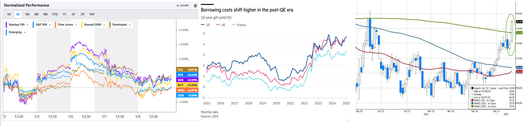 Il movimento più significativo delle prime giornate del 2025 è stato osservato sui tassi d’interesse, con i rendimenti che sono tornati a salire, spinti dalle aspettative di un’inflazione più persistente rispetto alle stime iniziali. Questa dinamica ha riportato in primo piano i cosiddetti Bond Vigilantes, riflettendo una maggiore attenzione degli investitori verso le politiche fiscali e monetarie.