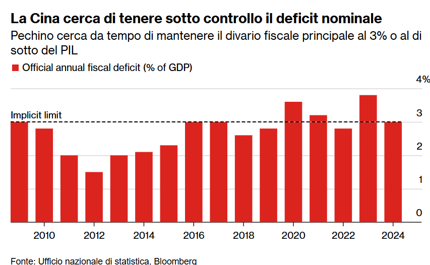 Come mostra il grafico che segue, Pechino si impegna da anni a mantenere il deficit fiscale annuale al di sotto del limite implicito del 3% del PIL, una soglia non scritta ma simbolicamente rilevante.