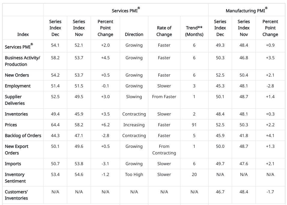 La tabella che segue fornisce una panoramica completa sulle tendenze degli indici ISM per il settore dei servizi e quello manifatturiero, offrendo un quadro dettagliato delle dinamiche economiche alla fine del 2024.