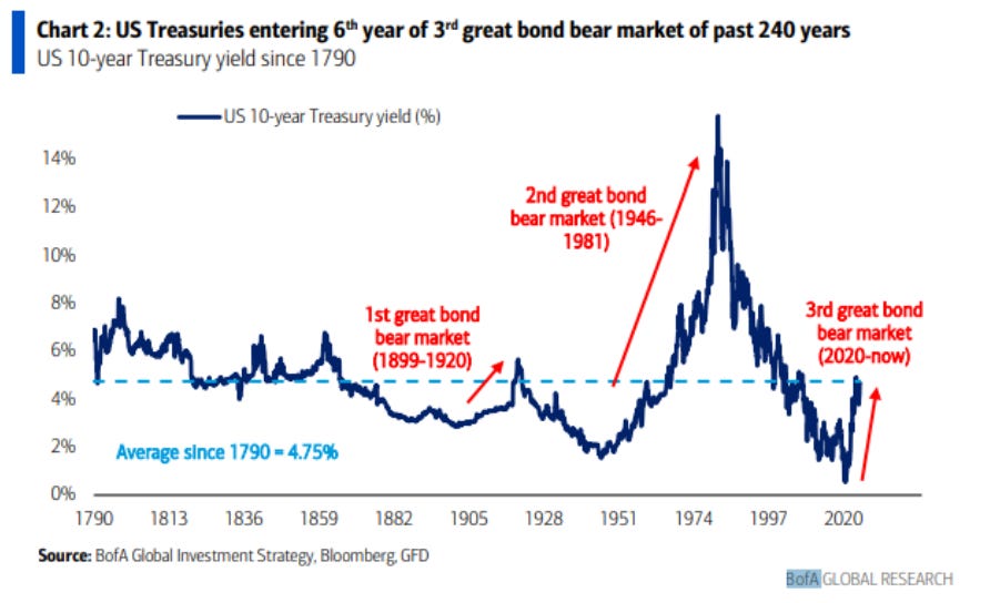 I titoli del Tesoro statunitensi stanno dunque entrando nel sesto anno del terzo grande mercato ribassista obbligazionario.