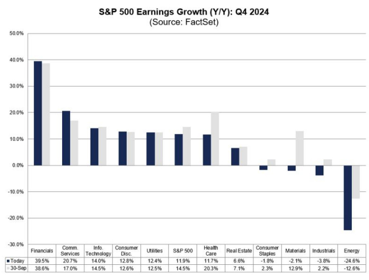 Secondo le stime attuali, la crescita degli utili complessiva per l'indice azionario S&P500 è prevista all'11%, un calo rispetto al +14,5% stimato al 30 settembre (si veda il grafico che segue).