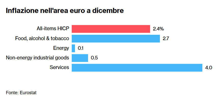 Come mostra il grafico che segue, l’inflazione nell’area Euro ha registrato un’accelerazione nel mese di dicembre, con un aumento del 2,4% dell’indice armonizzato dei prezzi al consumo (HICP).
