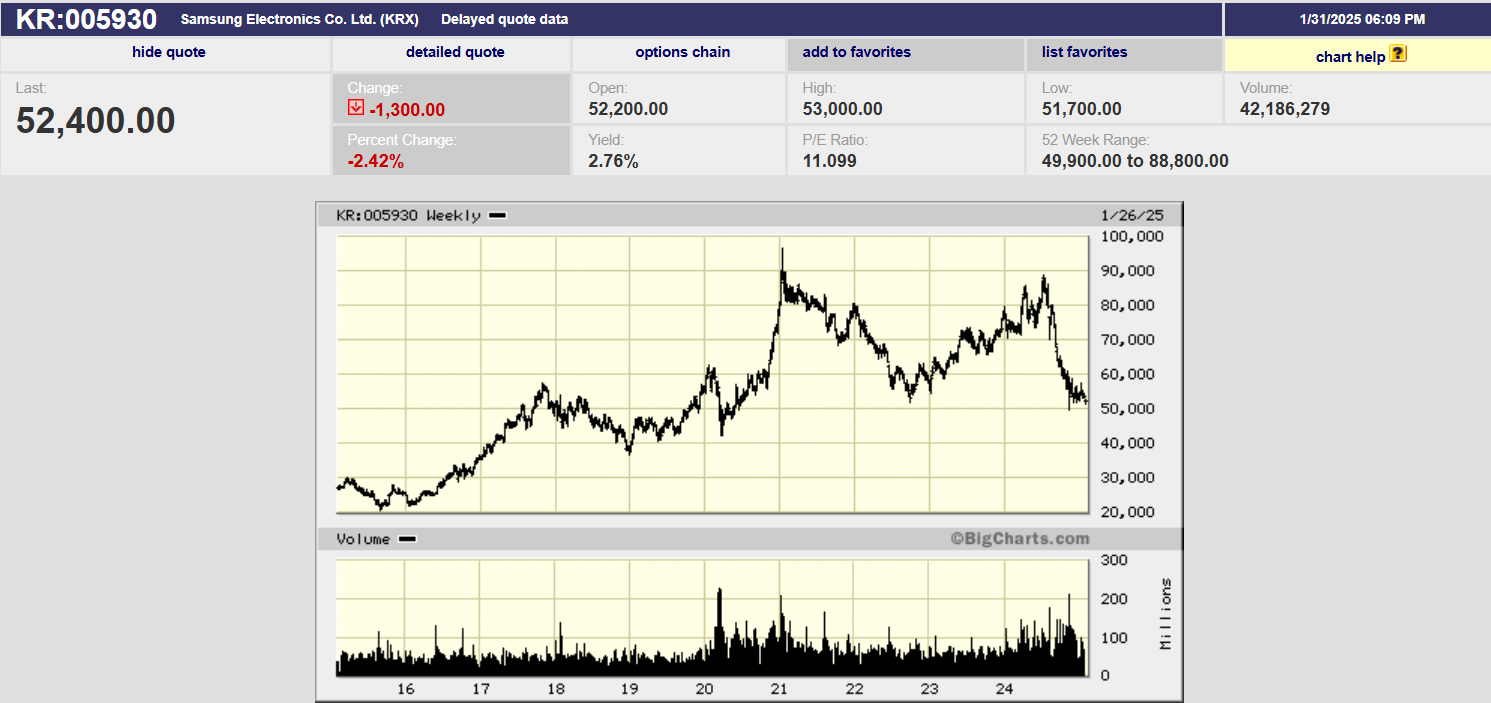 Il grafico in alto mostra l'andamento del titolo Samsung Electronics dal 2015 al 2025. Il grafico evidenzia una fase di crescita significativa fino a raggiungere massimi superiori ai 90.000 won, seguita da una fase di forte correzione, con il prezzo attuale stabilizzatosi attorno ai 52.400 won. Il trend riflette le difficoltà che la società sta affrontando nel settore dei semiconduttori, uno dei suoi core business, dove la competizione si sta facendo sempre più serrata.