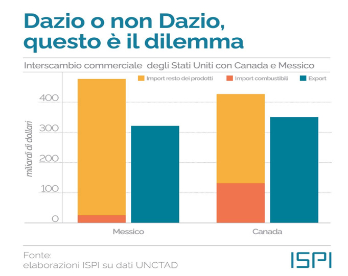La possibilità di introdurre tariffe doganali del 25% sulle importazioni da Messico e Canada sta generando preoccupazioni tra le aziende e gli investitori. Il grafico in alto mostra l’interscambio commerciale degli Stati Uniti con questi due Paesi, evidenziando la dipendenza reciproca nelle esportazioni e nelle importazioni.