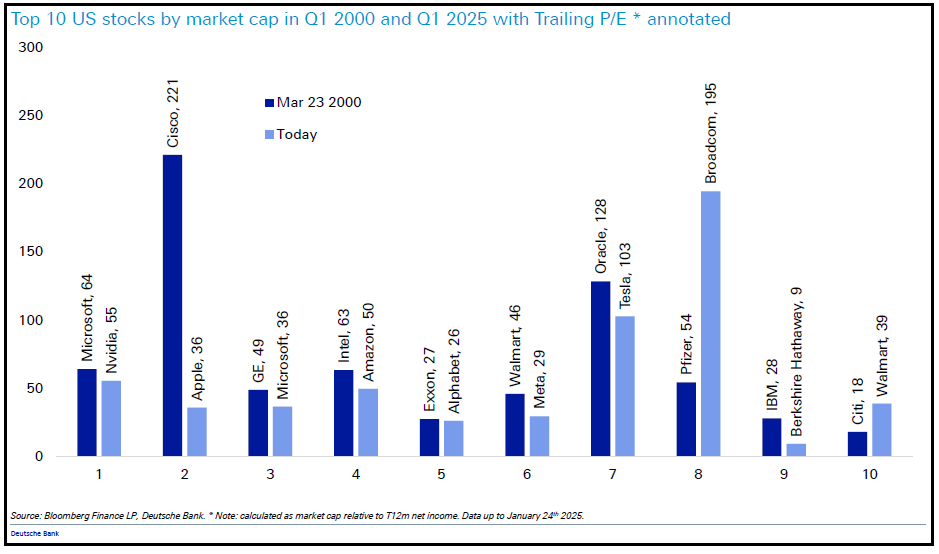 Evoluzione delle Top 10 aziende USA per capitalizzazione: confronto tra Q1 2000 vs Q1 2025 con P/E