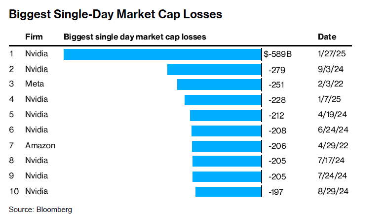 Gli indici azionari statunitensi hanno aperto con ribassi marcati: l’S&P 500 ha registrato un calo iniziale del 2%, mentre il Nasdaq ha subito una flessione superiore al 3%. Tuttavia, il titolo più colpito è stato NVIDIA, che ha aperto con una perdita del 17%, bruciando in poche ore circa 550 miliardi di dollari di capitalizzazione di mercato – una cifra pari a due terzi dell'intera capitalizzazione della Borsa italiana – segnando così la più grande perdita giornaliera di sempre per una singola azienda.