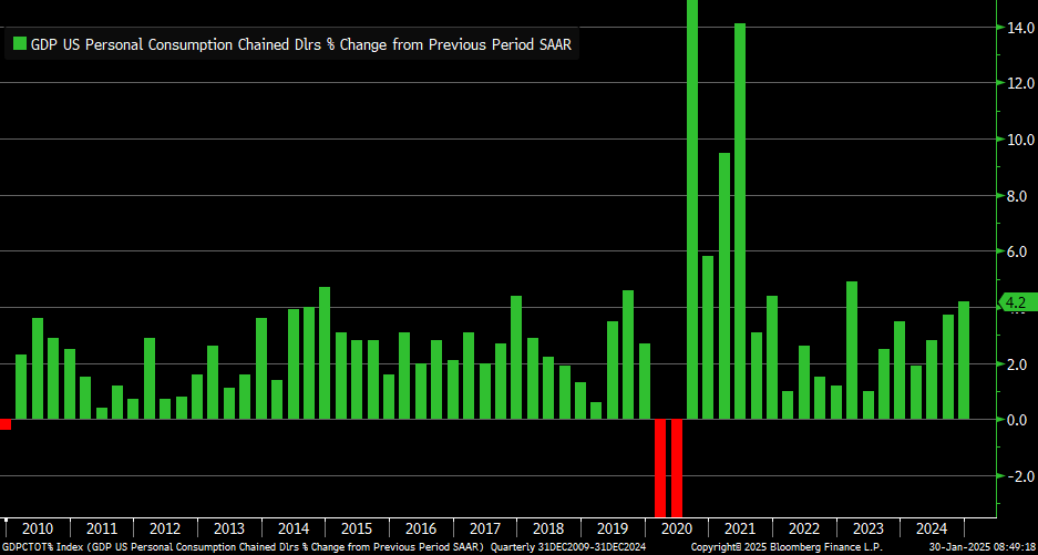 Il grafico che segue mostra la variazione percentuale trimestrale dei consumi personali negli Stati Uniti dal 2010 al 2024. Il valore più recente segna un aumento del 4,2%, segnalando una solida domanda dei consumatori che continua a sostenere l'economia statunitense.e
