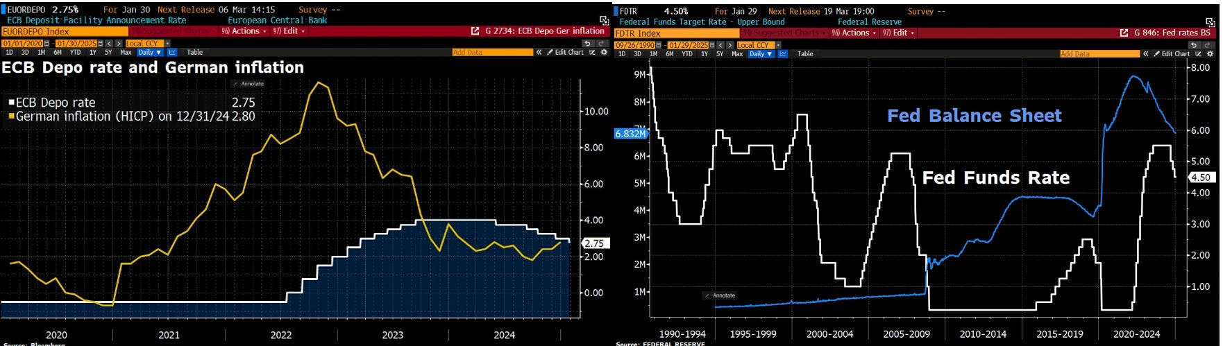 Tasso di Deposito BCE e inflazione tedesca Bilancio Fed e Tasso dei Fed Funds