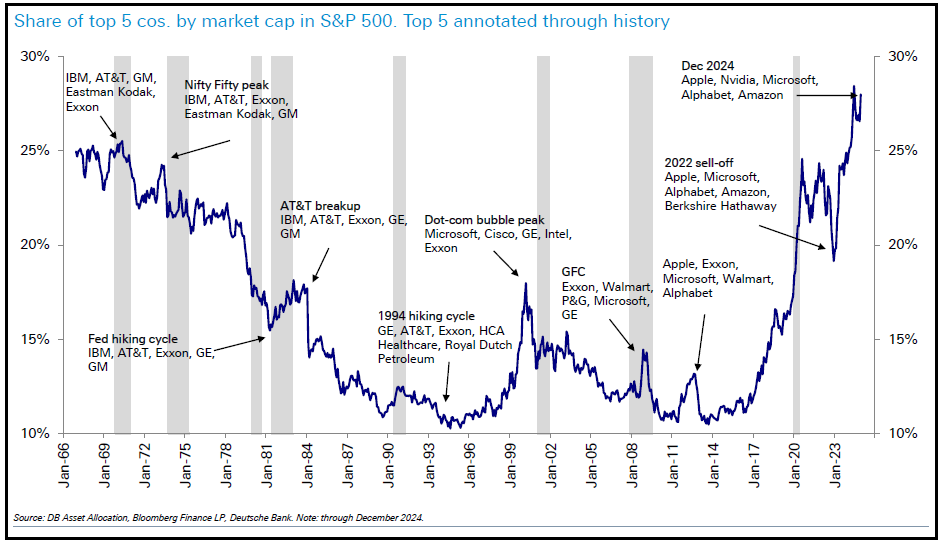 La figura che segue illustra l'andamento della quota di mercato detenuta dalle prime cinque aziende dell'S&P 500 dal 1966 al 2024.
