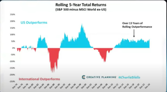 Le aree in blu indicano periodi in cui il mercato azionario statunitense ha sovraperformato quello internazionale, mentre le aree in rosso rappresentano la superiorità dell'azionario globale (esclusi gli USA).