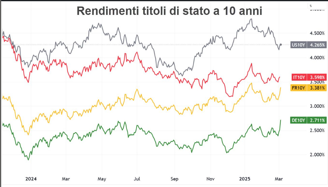 Il grafico che segue mostra l'andamento dei rendimenti dei titoli di Stato a 10 anni per Stati Uniti (US10Y), Italia (IT10Y), Francia (FR10Y) e Germania (DE10Y) da inizio 2024 a inizio marzo 2025.