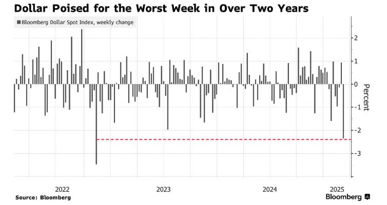 L’ultimo dato evidenzia una forte contrazione superiore al 2%, rappresentata dalla linea rossa tratteggiata, indicando la peggior settimana del dollaro in oltre due anni.