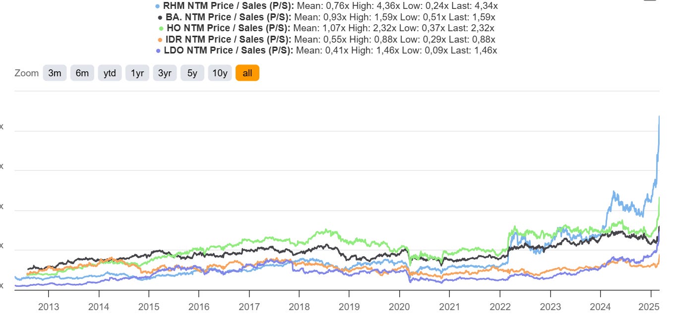 Andamento del multiplo Capitalizzazione/Ricavi alcuni titoli del settore difesa dal 2013 al 2025