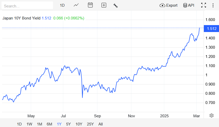 Tuttavia, la vera novità riguarda i titoli di Stato giapponesi, che stanno mostrando un notevole rialzo dei rendimenti a lungo termine, come emerge dal grafico che segue.