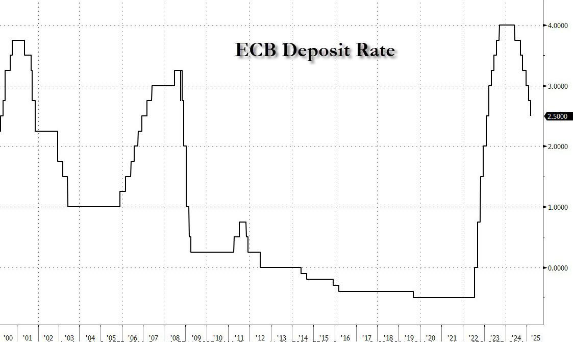 La Banca Centrale Europea (BCE) ha recentemente abbassato il tasso sui depositi al 2,5% dal precedente 2,75%, in linea con le attese degli analisti, come di seguito raffigurato.