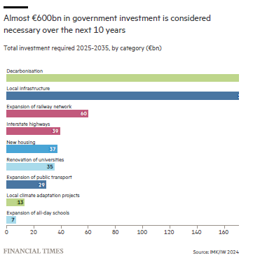 Riepilogando, le aree con i maggiori fabbisogni di investimento includono le infrastrutture locali e la decarbonizzazione, seguite dall'espansione della rete ferroviaria (60 miliardi di euro) e dalle autostrade interstatali (39 miliardi di euro). Altri settori chiave sono l’edilizia residenziale, la ristrutturazione delle università, il trasporto pubblico e l’adattamento climatico locale.