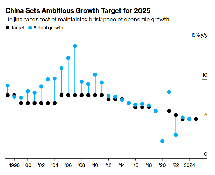 La Cina ha fissato un ambizioso target di crescita economica attorno al 5% per il 2025, come emerge dal grafico che segue che mostra il confronto tra gli obiettivi di crescita economica fissati dal Governo cinese (punti neri) e la crescita effettiva registrata (punti celesti) dal 1998 al 2025.