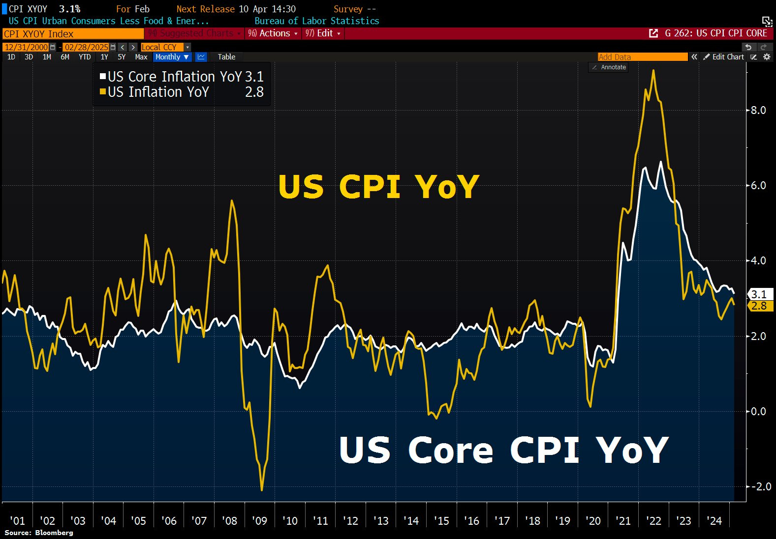 Tuttavia, il dato relativo al Core CPI (in bianco), che esclude elementi più volatili come energia e alimentari, rimane ancora leggermente più elevato al 3,1%. Questo indica che mentre i prezzi generali rallentano rapidamente, quelli di alcuni servizi continuano a essere più persistenti.