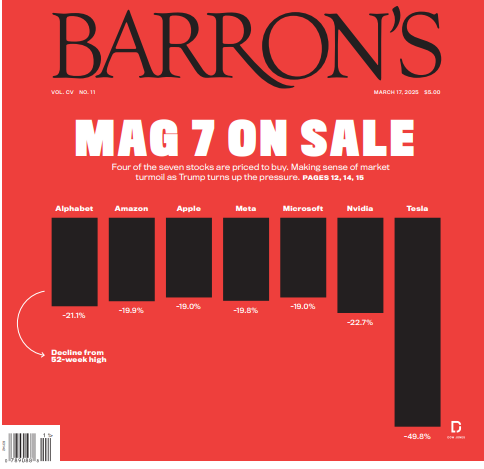 Va evidenziato che la caduta dell'S&P500 è stata principalmente causata dalla significativa correzione delle cosiddette "MAG7", le sette principali big tech statunitensi, come ben rappresentato dalla copertina di Barron's dello scorso 17 marzo di seguito raffigurata, che mostra il calo di queste società rispetto ai massimi raggiunti nelle ultime 52 settimane.