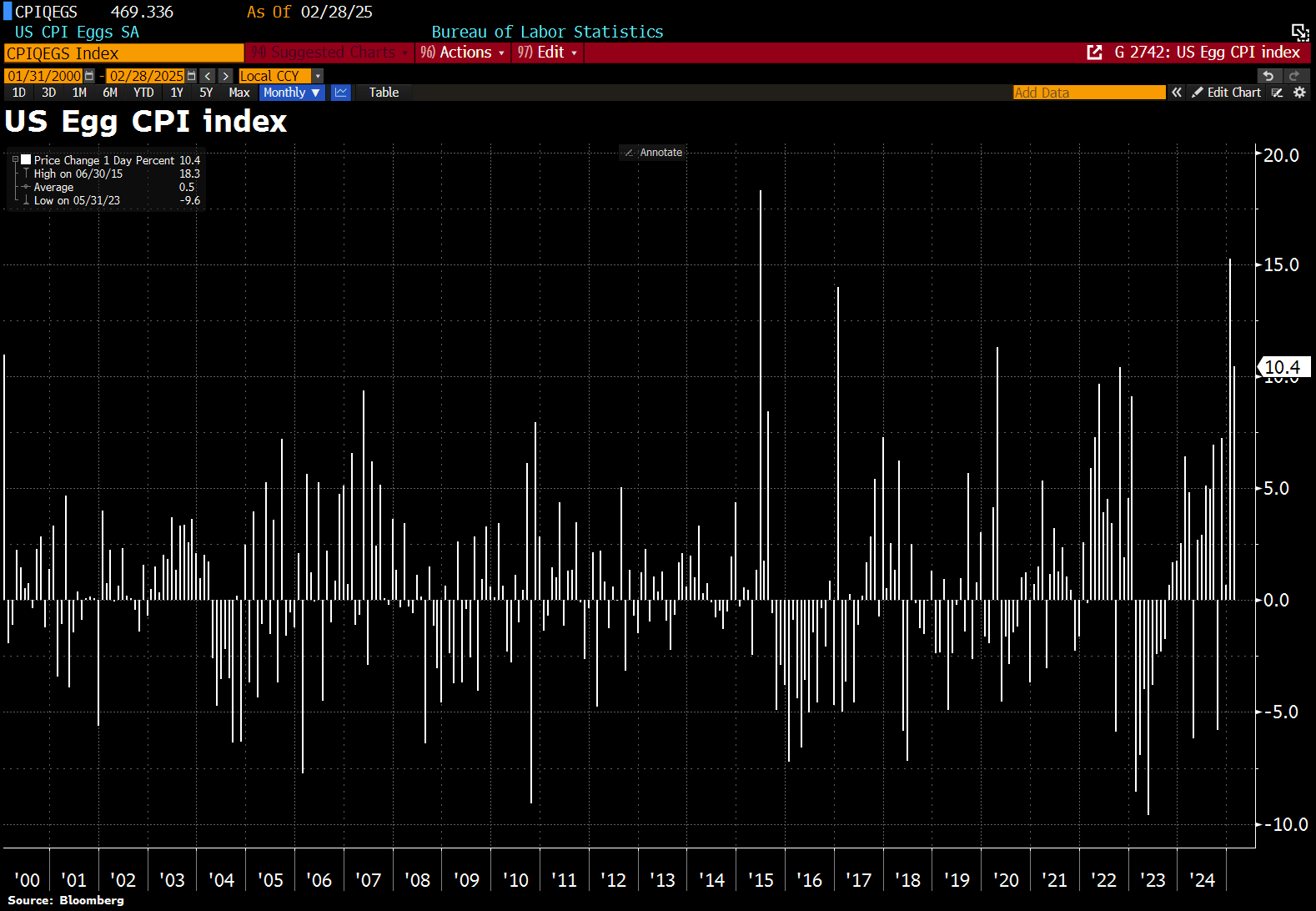 Variazione mensile dell'indice dei prezzi delle uova negli USA dal 2000 a febbraio 2024