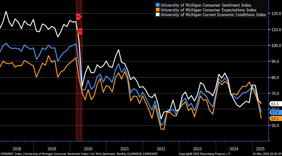 Queste tensioni si riflettono chiaramente anche nella fiducia dei consumatori americani, come mostrato di seguito dall'Indice dell'Università del Michigan dal 2018 al 2025.
