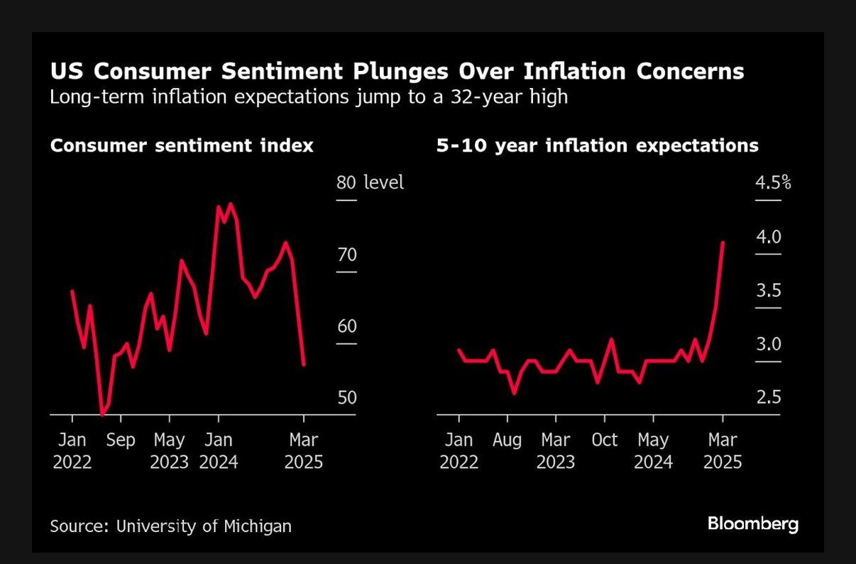 Nel marzo 2025, l’indice della fiducia dei consumatori è crollato al livello più basso degli ultimi due anni, segnalando un netto peggioramento dell’umore delle famiglie americane. Allo stesso tempo, le aspettative d’inflazione a lungo termine sono balzate al 4,1%, il valore più alto degli ultimi 32 anni.