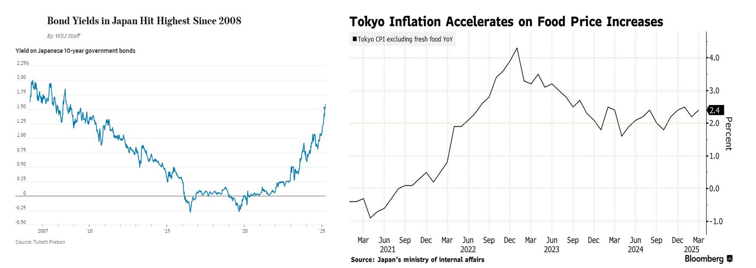 In Giappone, l’inflazione continua a rimanere sopra i livelli abituali, attestandosi al 2,4% a marzo 2025, spinta soprattutto dall’aumento dei prezzi alimentari. Queste pressioni inflazionistiche si riflettono anche sui tassi di interesse: il rendimento dei titoli di Stato a 10 anni ha superato la soglia dell'1,5% toccando i massimi dal 2008. Questo segnale potrebbe rappresentare un punto di svolta, dopo anni di politica monetaria ultra-espansiva e tassi prossimi allo zero.