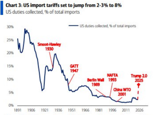 La linea blu indica quanti dazi (cioè tasse doganali) gli Stati Uniti hanno applicato ai prodotti importati, espressi come percentuale sul valore totale delle importazioni.