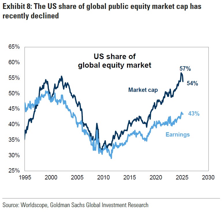 Il grafico di seguito riportato, realizzato da Goldman Sachs, mostra l'andamento della quota americana rispetto alla capitalizzazione totale (Market Cap) e agli utili aziendali globali (Earnings) dal 1995 al 2025.
