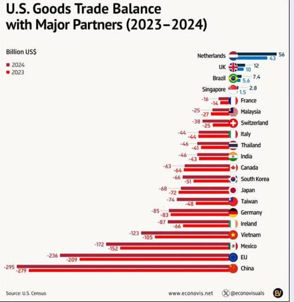 Nonostante una leggera riduzione, il deficit con la Cina rimane il più alto (-279 miliardi di dollari nel 2024), rappresentando una delle principali fonti di tensione commerciale.