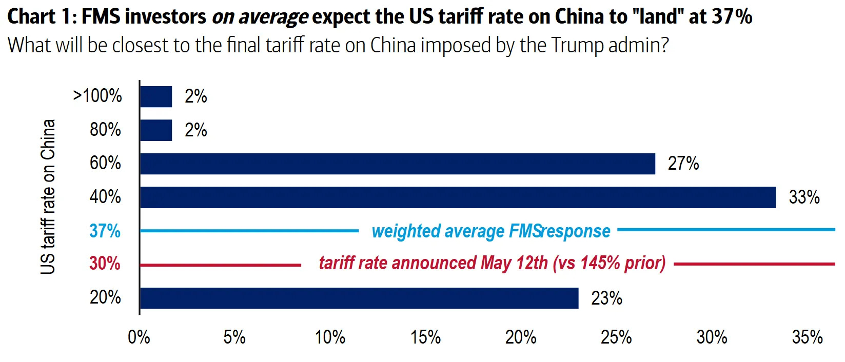 La maggioranza relativa degli investitori (33%) ipotizza tariffe intorno al 40%, con una media ponderata del 37%, ben lontana dagli estremi iniziali del 145% ventilati in passato.