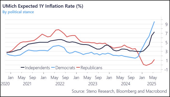 Le aspettative di inflazione percepite dai cittadini americani confermano ulteriormente un quadro misto e influenzato dal clima politico, come evidenziato dal grafico seguente: