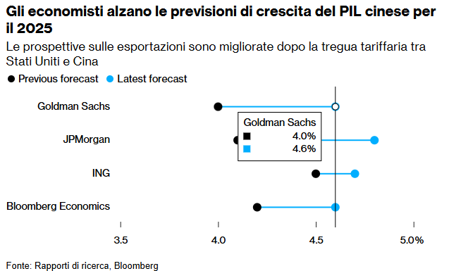 La recente tregua sui dazi ha infatti portato diversi istituti finanziari, tra cui Goldman Sachs, JPMorgan, ING e Bloomberg Economics, a rivedere al rialzo le loro previsioni sul PIL cinese per il 2025, come evidenziato chiaramente nel grafico seguente: