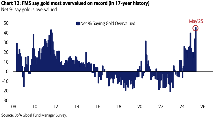 Il forte interesse per l’oro è accompagnato da una percezione record della sua sopravvalutazione, come emerge dal grafico che segue.