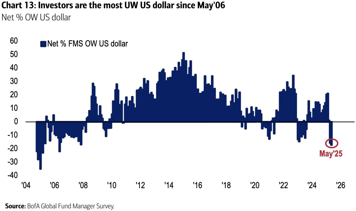 Infine, il dollaro ha subìto un drastico calo di fiducia da parte degli investitori, raggiungendo un sottopeso mai visto dal 2006, segnale chiaro della crescente sfiducia verso la valuta americana.