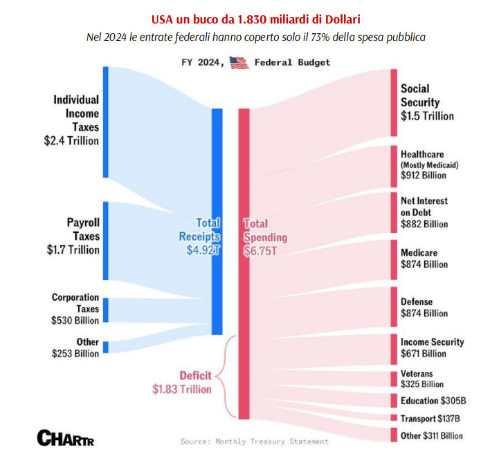 A questo proposito, osserviamo di seguito il secondo grafico, che mostra chiaramente la situazione delle finanze pubbliche americane per l’anno 2024: