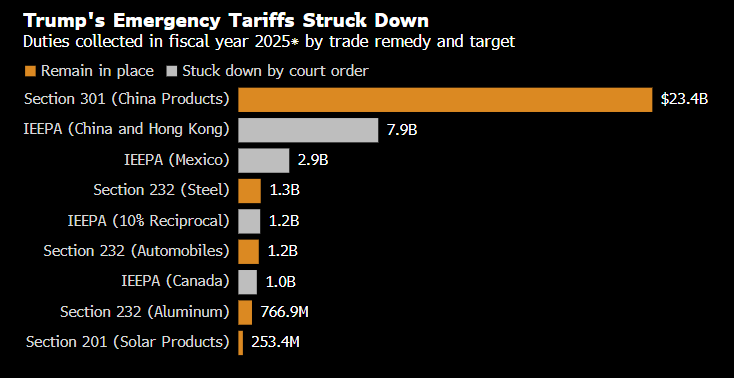 Questo significa che molte delle tariffe adottate per frenare le importazioni da Paesi come Cina, Messico e Canada, sotto la cosiddetta legge IEEPA, sono state cancellate.