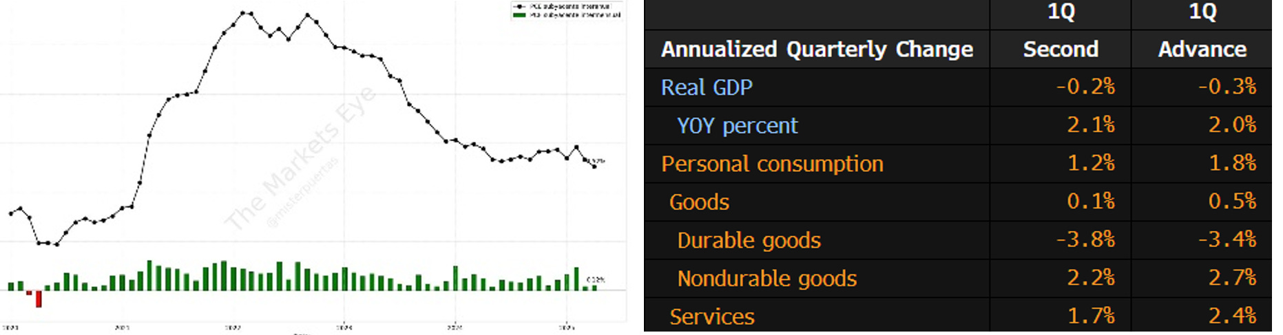 Passando rapidamente all'analisi del PCE di aprile, il dato è risultato in linea con le previsioni, con un modesto aumento dello 0,1% sia per l’indice generale che per quello core (esclusi alimentari ed energia).
