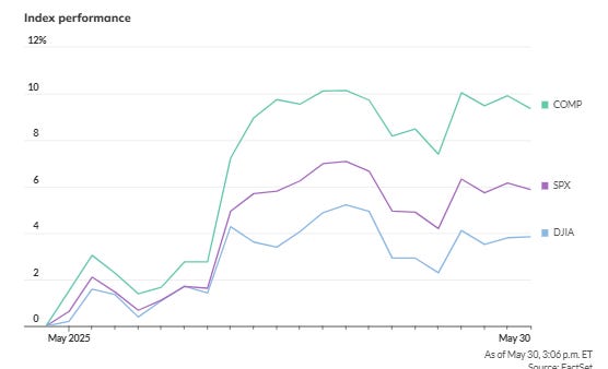Questo grafico mostra come, nel mese di maggio 2025, il Nasdaq Composite (linea verde, COMP) abbia registrato una crescita di quasi il 9%, la miglior performance per il mese di maggio dal 1997, grazie soprattutto al forte impulso dei titoli tecnologici.