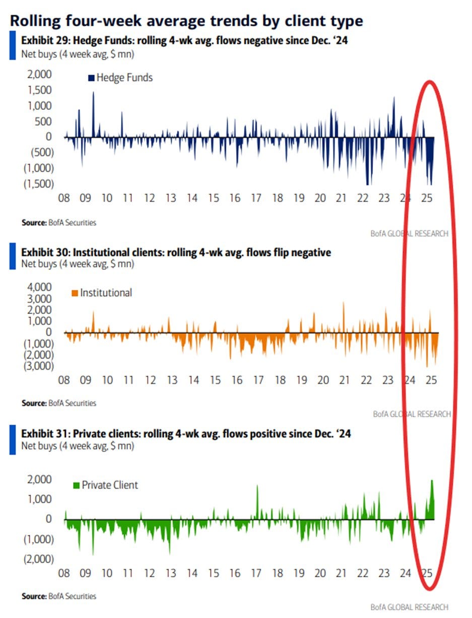 Dall'analisi del grafico emerge infatti un comportamento ben definito: dal dicembre 2024, gli hedge fund (in blu) hanno iniziato a vendere costantemente azioni, raggiungendo livelli che non si vedevano dal crollo del mercato del 2022, con vendite nette di circa 1,5 miliardi di dollari nelle ultime quattro settimane.
