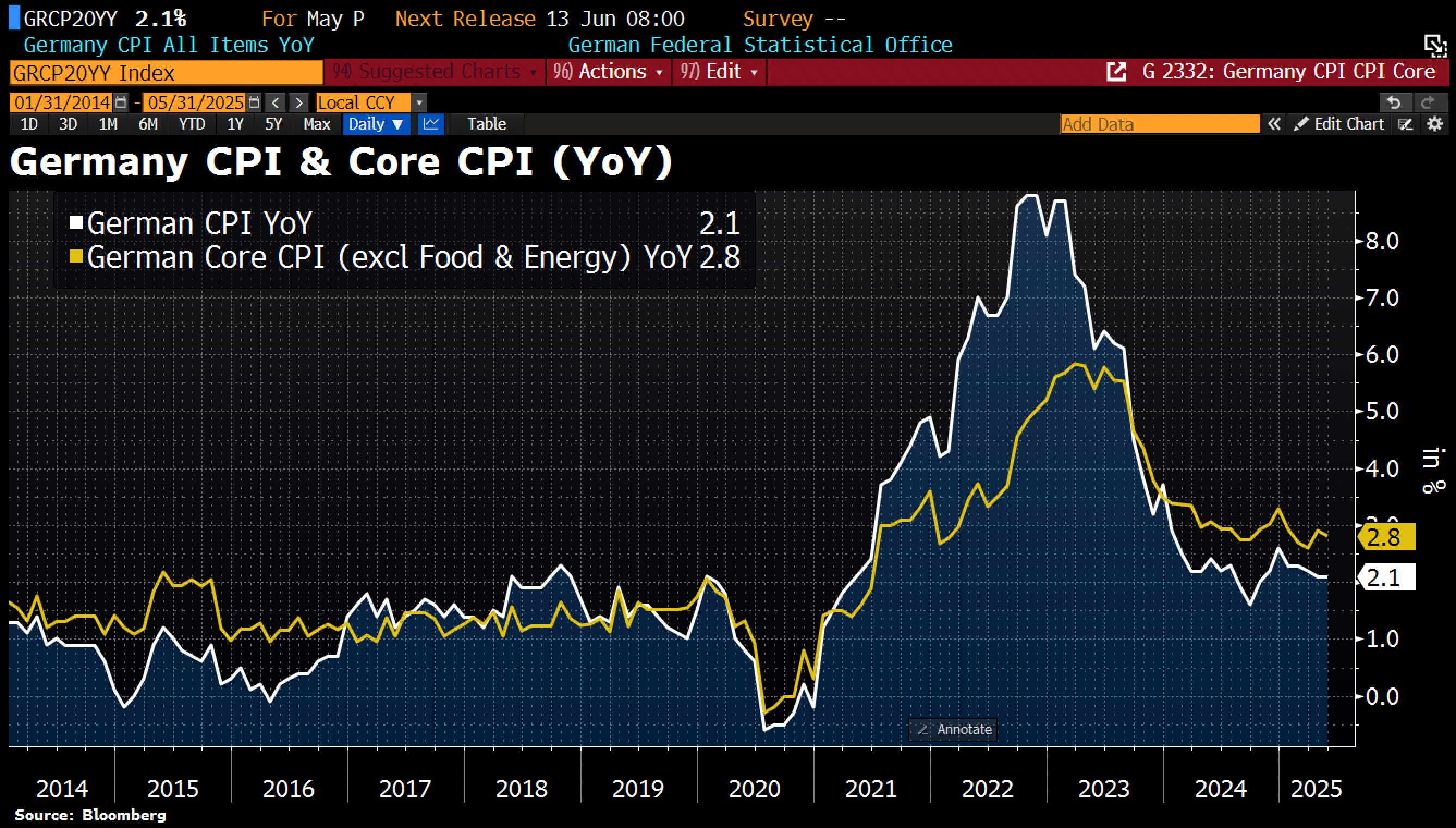 Passando all’Europa, uno sguardo particolare va rivolto alla Germania, dove l’inflazione si mantiene sotto stretta osservazione, come di seguito raffigurato: