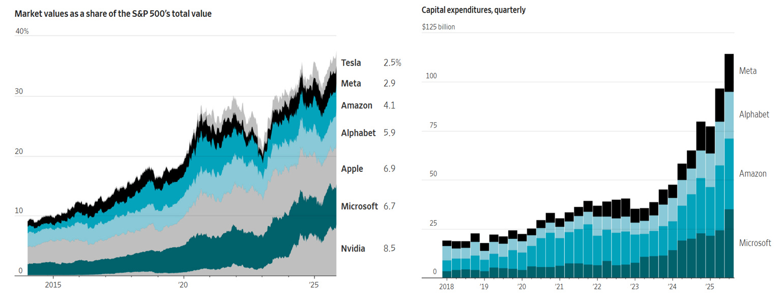 Per capire l’impatto di questa corsa, basta osservare i due grafici in basso, che raccontano meglio di mille parole come il potere di poche aziende stia ridisegnando il volto della Borsa americana e come gli investimenti stiano crescendo a ritmi mai visti.