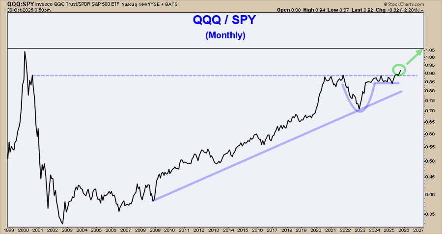 In pratica, il rapporto tra i due indici ha superato una soglia tecnica (la linea tratteggiata nel grafico) che per anni aveva fatto da “tetto” al movimento dei prezzi: un segnale che molti analisti leggono come l’inizio di una nuova fase di forza relativa per il settore tech.