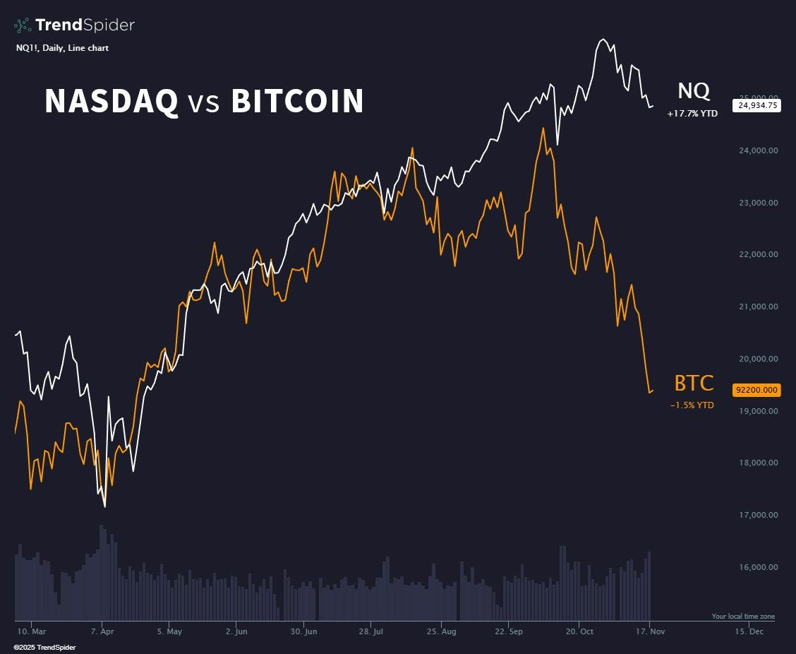 Fino all’estate le due curve si muovevano quasi all’unisono, segnalando un contesto in cui tecnologia e criptovalute reagivano agli stessi impulsi.
