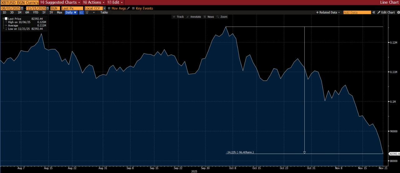 Nell’ultima seduta della scorsa settimana il calo si è accentuato fino a toccare la soglia di 80.760 dollari per poi chiudere a quota 84.810, ai minimi da aprile, segnale di un mercato decisamente più prudente e di una pressione di vendita crescente.