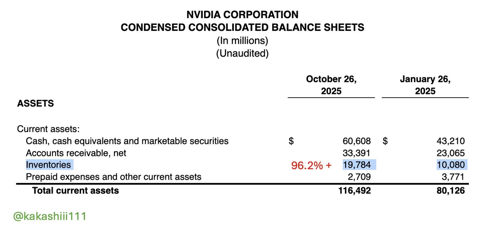 Un secondo segnale importante emerge osservando il grafico seguente, che mostra come sia cambiato l’attivo corrente di NVIDIA – cioè l’insieme delle risorse facilmente utilizzabili entro un anno, come scorte, crediti e liquidità – tra gennaio e ottobre 2025.